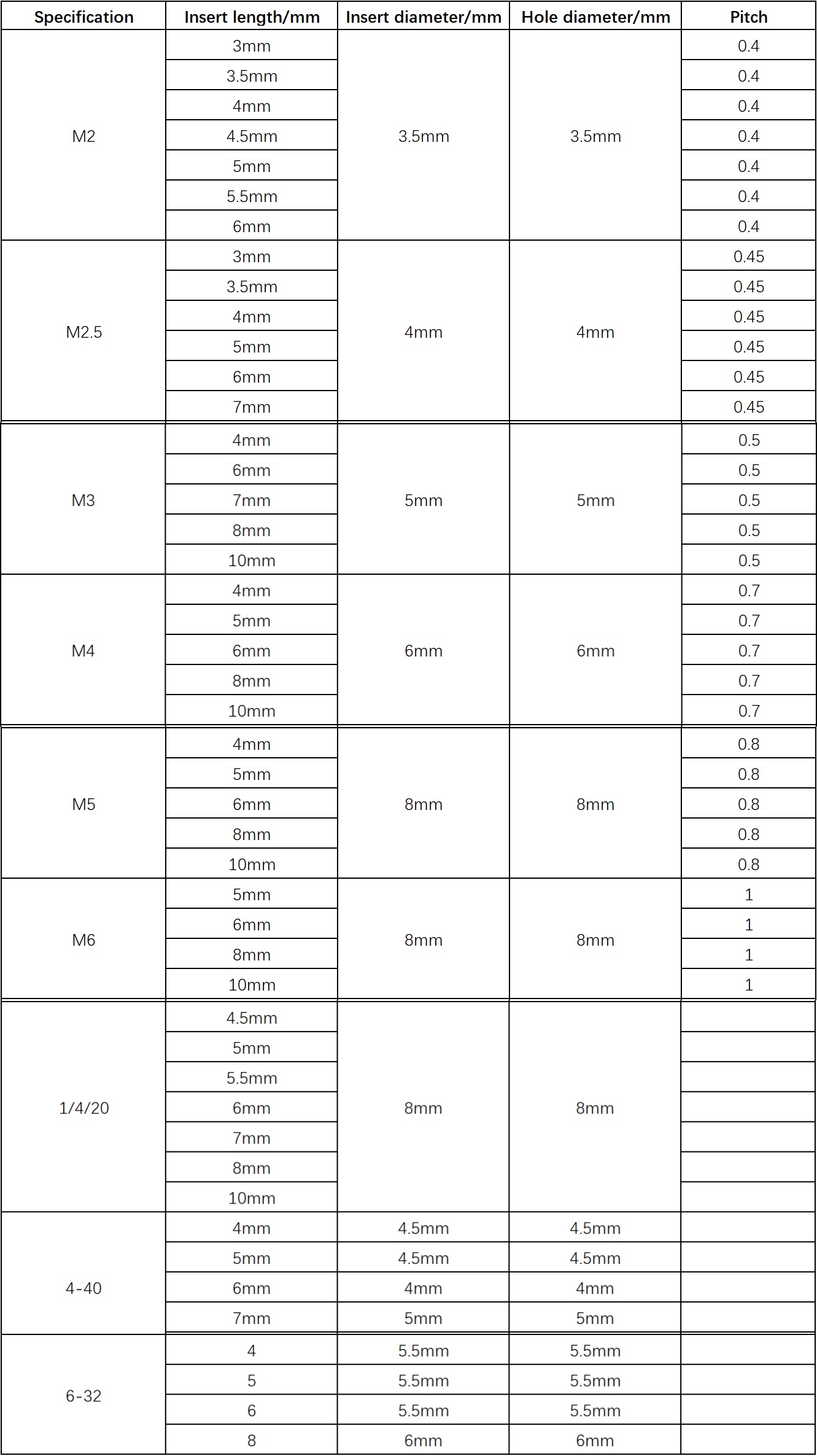 Brass inserts provide greater wear resistance and long-term durability compared to tapped threads in 3D printed parts. However, because the specifications and dimensions of brass inserts vary by country and manufacturer, the following design guidelines are provided for reference.