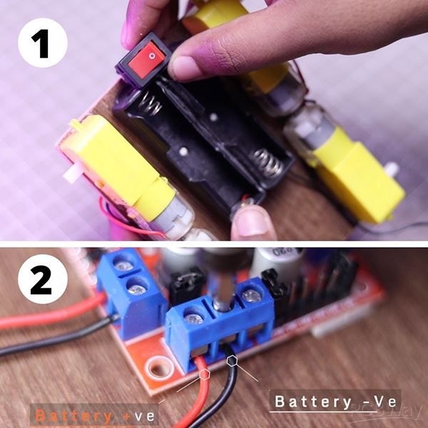 The battery wires will be connected with the motor driver input wires. You can also clearly see where to connect the battery wires.