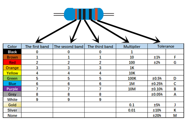 The commonly used color-coded resistors can be divided into four-band and five-band types, with the four-band type being more commonly used. For a four-band resistor, the first two bands represent digits, the third band indicates the multiplier, and the last band represents the tolerance. In a five-band resistor, the first three bands represent digits, the fourth band indicates the multiplier, and the last band represents the tolerance. The tolerance is typically indicated by gold, silver, and brown colors, where gold represents a 5% tolerance, silver represents a 10% tolerance, and brown represents a 1% tolerance. Additionally, no color represents a 20% tolerance, and occasionally green is used to represent a 0.5% tolerance.