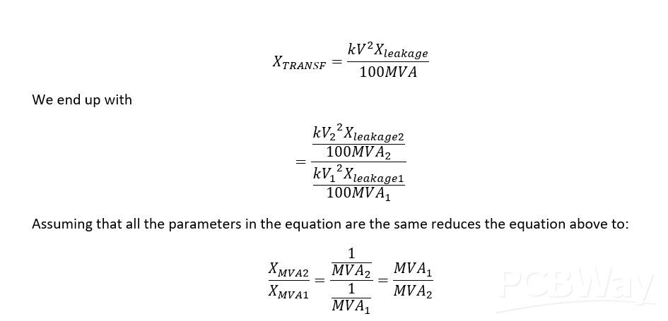 This equation gives us the impedance ratio for how the new transformer to the old transformer varies. For example, a 60-MVA transformer will give an impedance twice as small as a transformer of 30-MVA will give and increase the short-circuit by double, where the assumption is that the two transformers suffer the same leakage current problem.