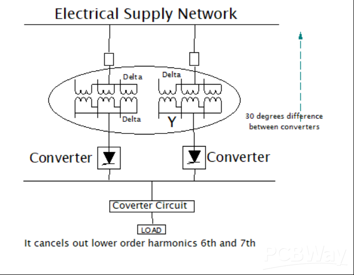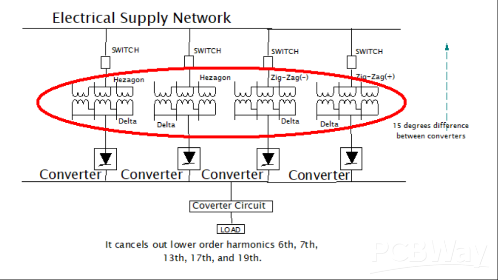 If you want to reduce other harmonic currents, you carry out a phase multiplication. For example, a 24-pulse unit is constructed from a combination of four pulse full-wave rectifier bridges, each having a 15-degree phase shift compared to other rectifying units. This is made possible by utilizing phase-shifting transformers that separate the additional windings connected in a zigzag. See the figure below.