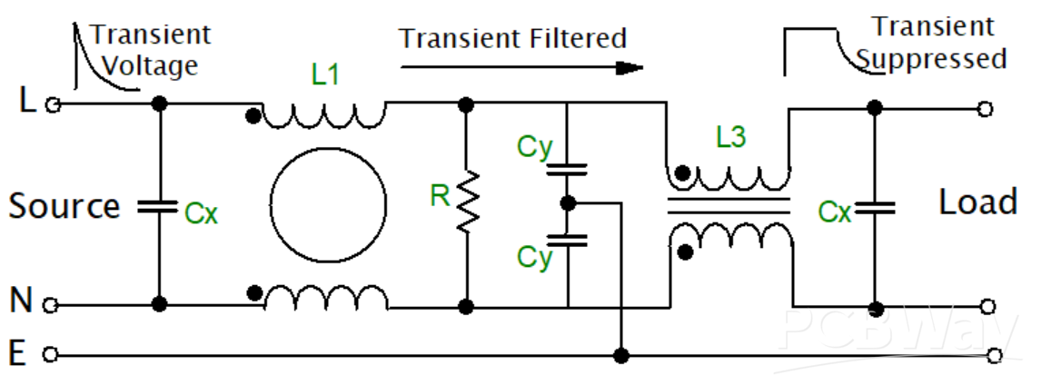 The diagram represents a simple two-stage filter of the low-pass type, which provides a high-voltage loss insertion between the line-to-ground and line-to-line, hence offering significant transient protection and noise reduction in the power supply system.