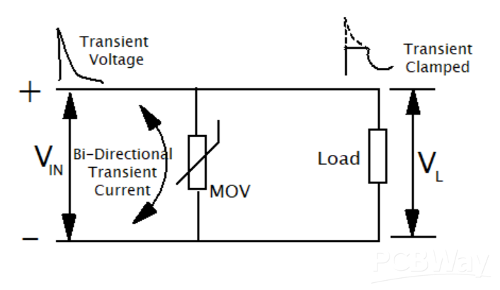 This is the most common suppression device that exists. The specifications of high voltage ratings and the ability to handle much higher current surges make them suitable for this function. These devices are used in the DC and AC power supply lines to protect against overvoltage transients. MOV is a voltage-dependent variable resistor. It is positioned parallel to the connected load, ready for protection, and at low voltage, they have a very high voltage compared to the higher voltage. Their primary purpose in the circuit is to protect the load against overvoltage transients and surges on the power line.