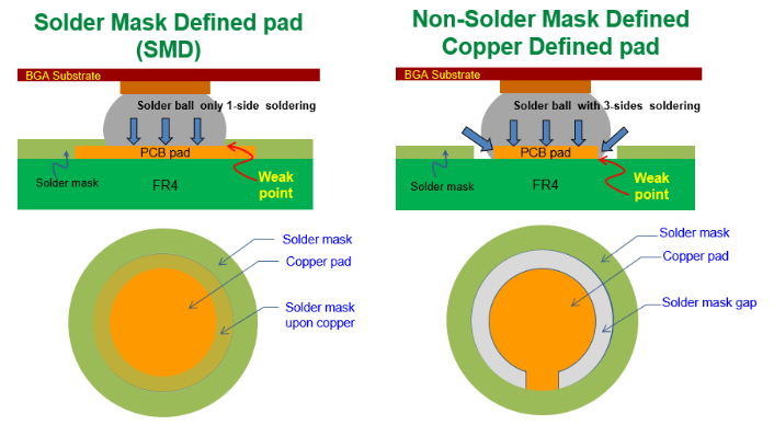 The choice between NSMD and SMD pads directly affects layout flexibility. NSMD pads offer a larger solderable area because the solder mask opening is larger than the copper pad, resulting in better solder joint formation and reduced stress concentration at BGA joints. They also provide more routing space between pads and are widely preferred for BGA designs. SMD pads, while offering stronger pad adhesion in some cases, further reduce pad spacing and increase the risk of solder mask misalignment and bridging.