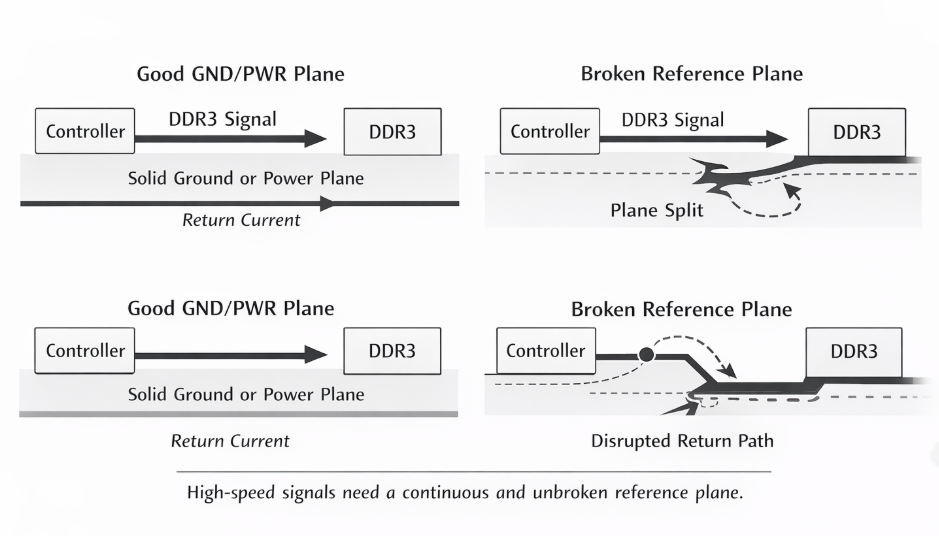 - Ensure all signal traces have a continuous and complete reference plane, either a ground plane or a power plane. For AC signals, ground and power planes are equivalent in terms of AC potential at high frequencies.