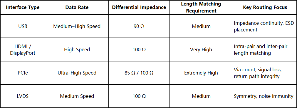 - Intra-pair length differences should be kept very small, typically within 5–10 mils.