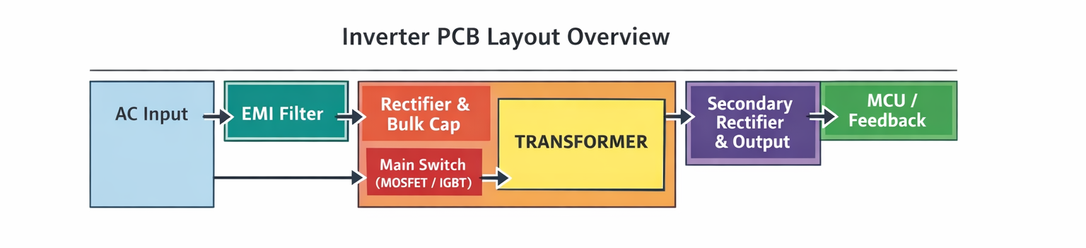 A typical layout sequence is: AC input → EMI filter → rectifier → bulk filter capacitors → transformer.