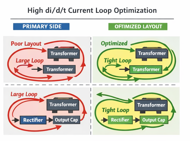 To reduce high di/dt current loop areas, the transformer should be placed close to the main switching devices and the rectification/filtering circuits. Shorter power paths help reduce parasitic resistance and inductance, thereby improving efficiency.