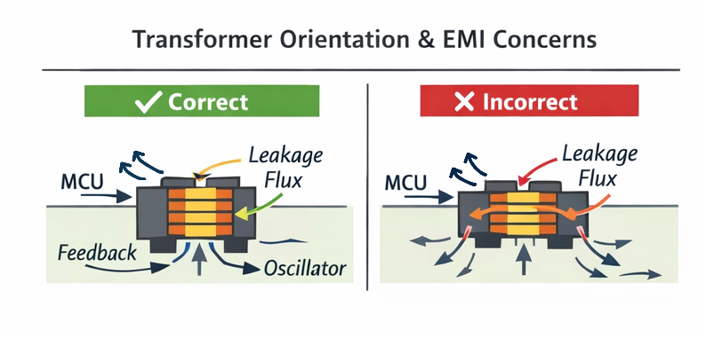 The transformer should be oriented so that its secondary side (output side) routing is perpendicular to nearby high-frequency or high-speed signal traces, reducing mutual coupling and interference.