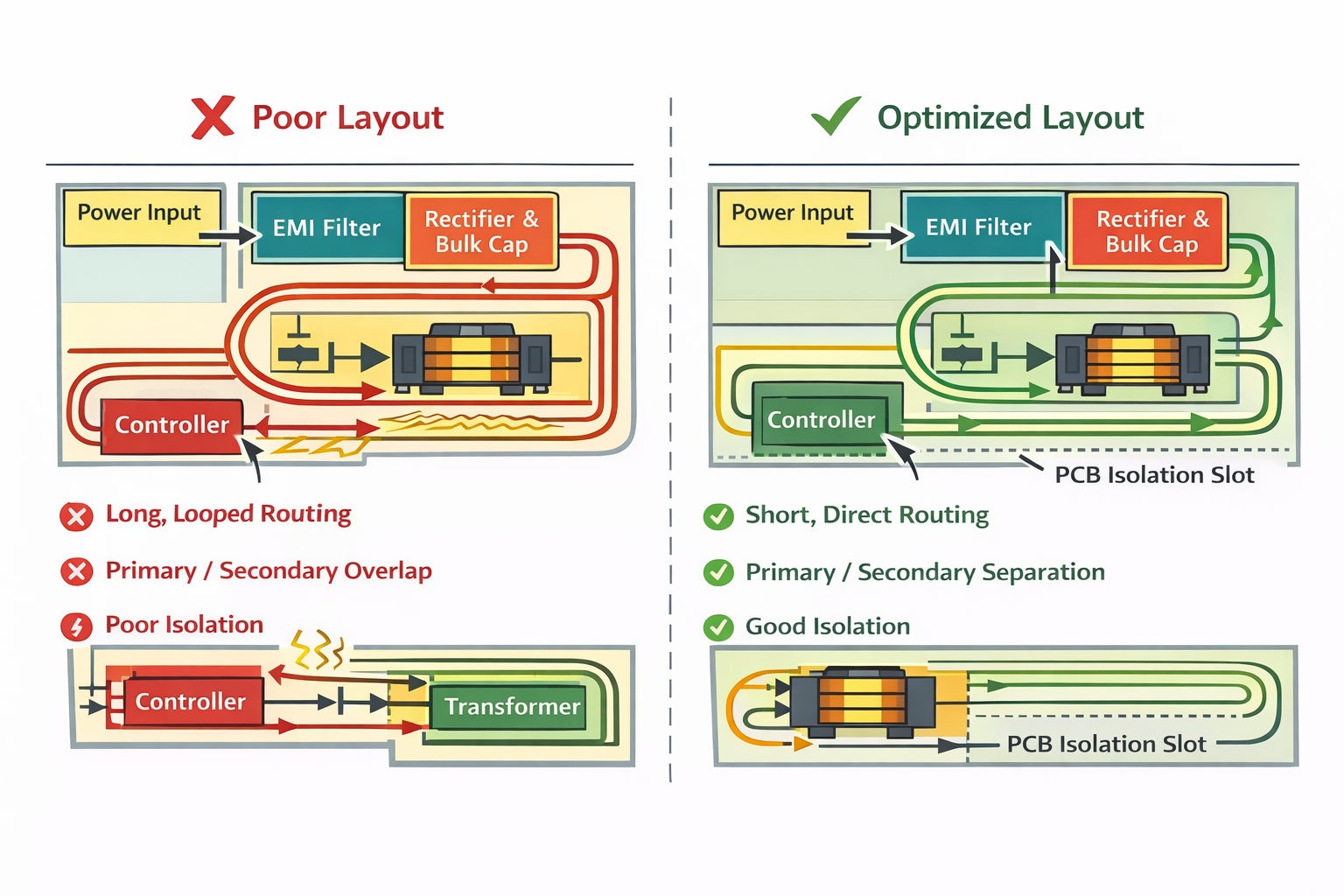 2. Secondary side: Transformer → Rectifier → Output capacitor → Transformer. Rectifier diodes should be placed close to the transformer pins, and output capacitors should be located near the rectifier outputs to minimize loop area.