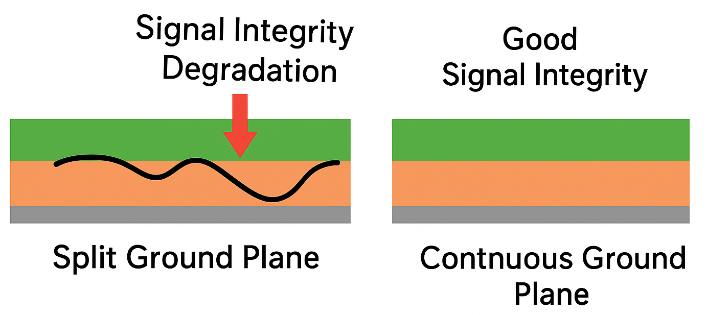 Never split the ground plane — breaks in the return path can severely compromise signal integrity.