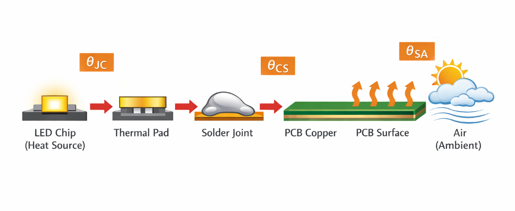 1. Junction → Package (θJC): Heat first travels from the LED PN junction to the thermal pad or package base. This internal thermal resistance is defined by the LED manufacturer as θJC (junction-to-case thermal resistance).