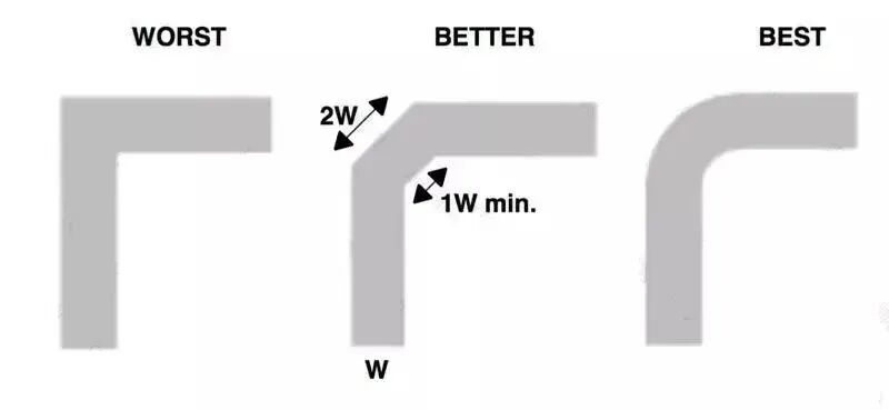 Straight 90° or sharp bends in RF traces, especially without compensation, cause local electric field concentration and effective trace width changes. This leads to impedance discontinuities, increased signal reflections, and enhanced radiation, particularly at GHz frequencies.