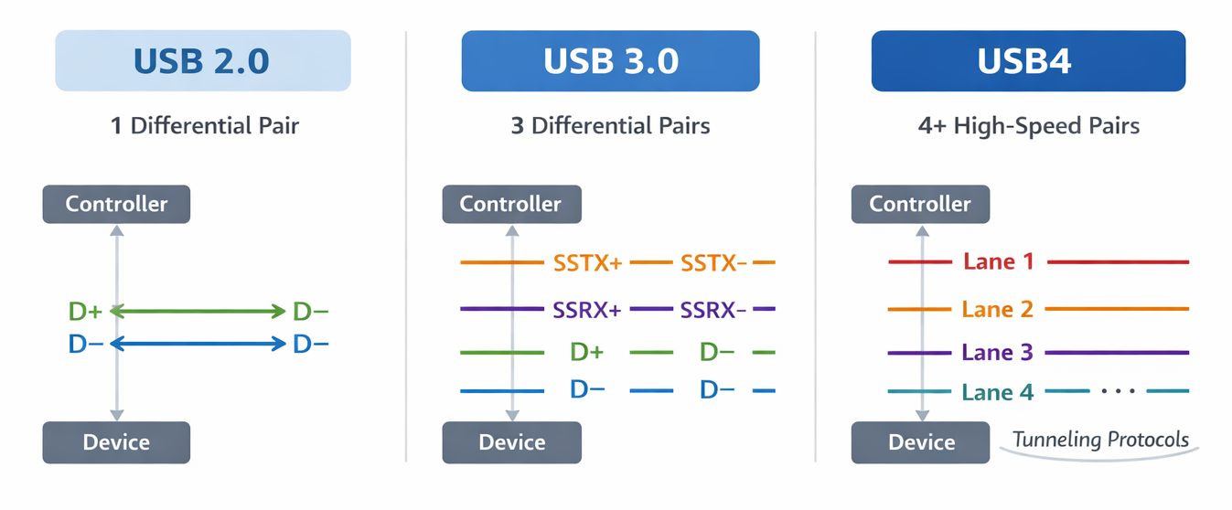 This article focuses on the key differences in USB PCB layout and USB PCB design across USB 2.0, USB 3.0, and USB4. As data rates increase, PCB design requirements evolve from basic routing practices to highly precise, simulation-driven high-speed design methodologies.
