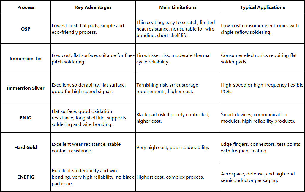 Surface treatments such as ENIG, OSP also affect FPC price. Different finishes vary in cost, reliability, shelf life, and compatibility with soldering or wire bonding.