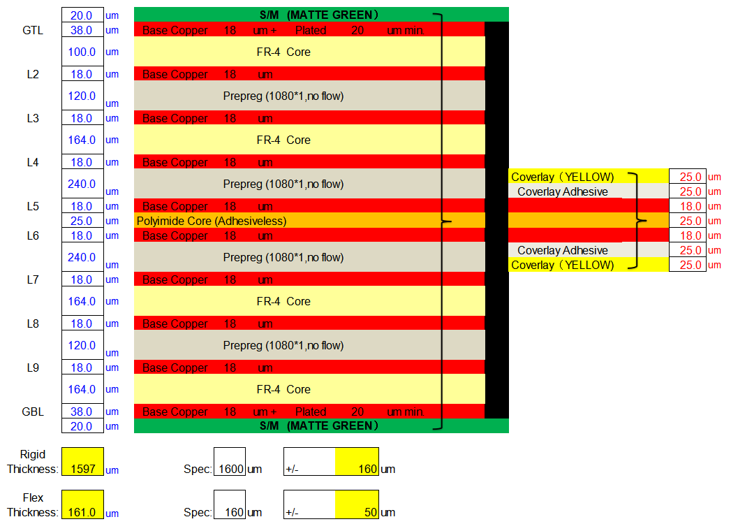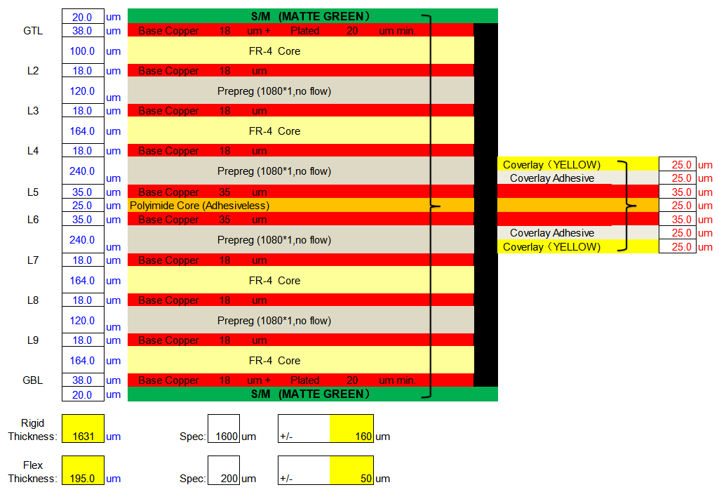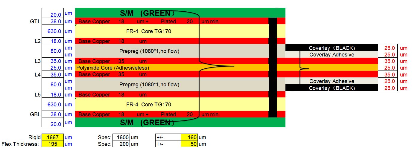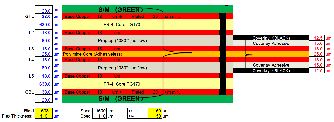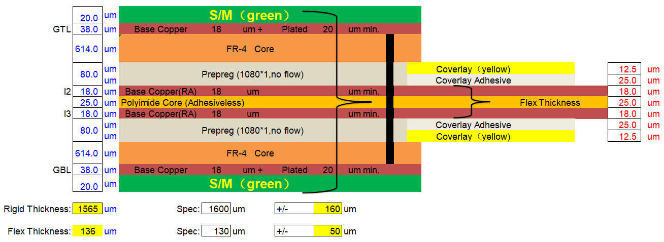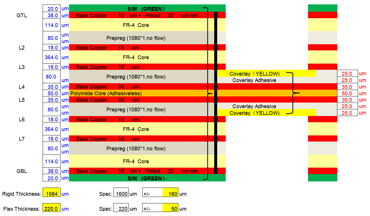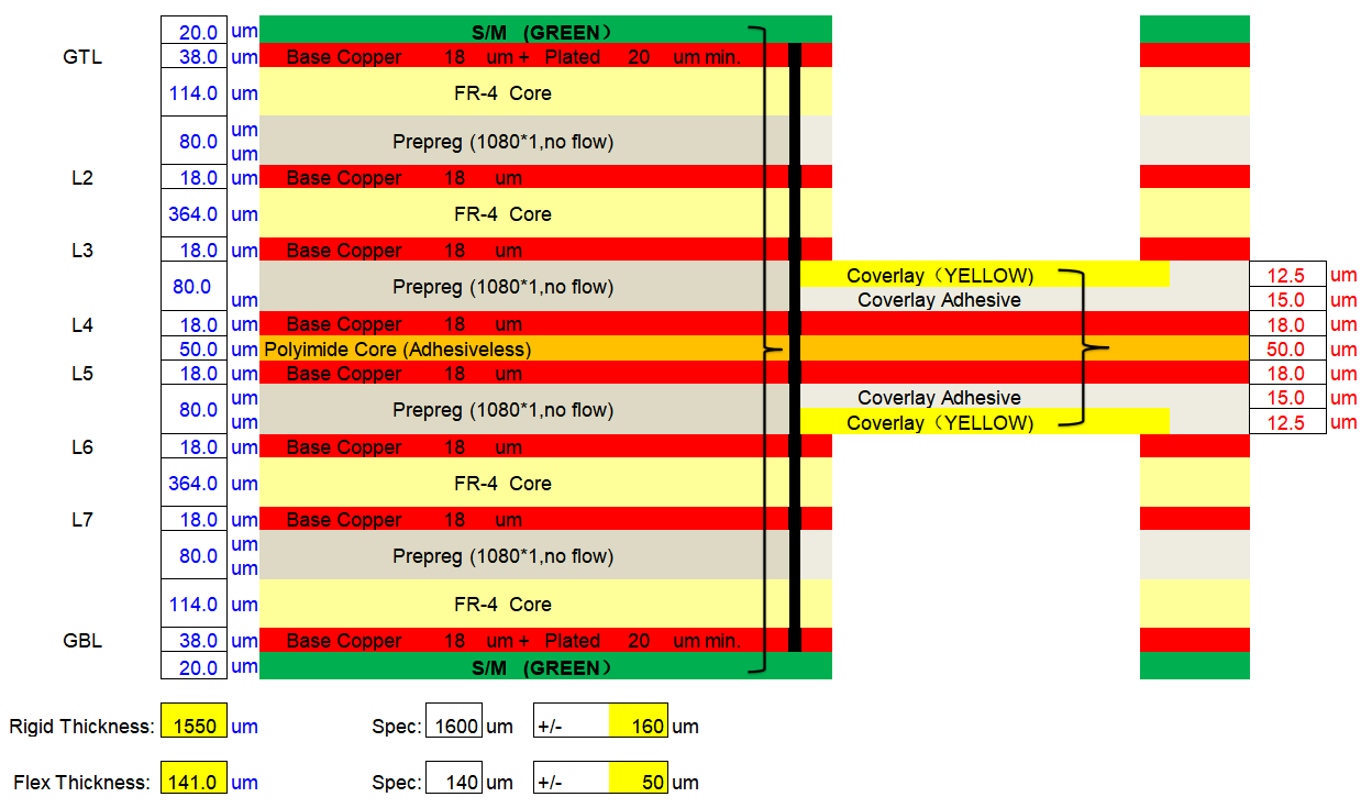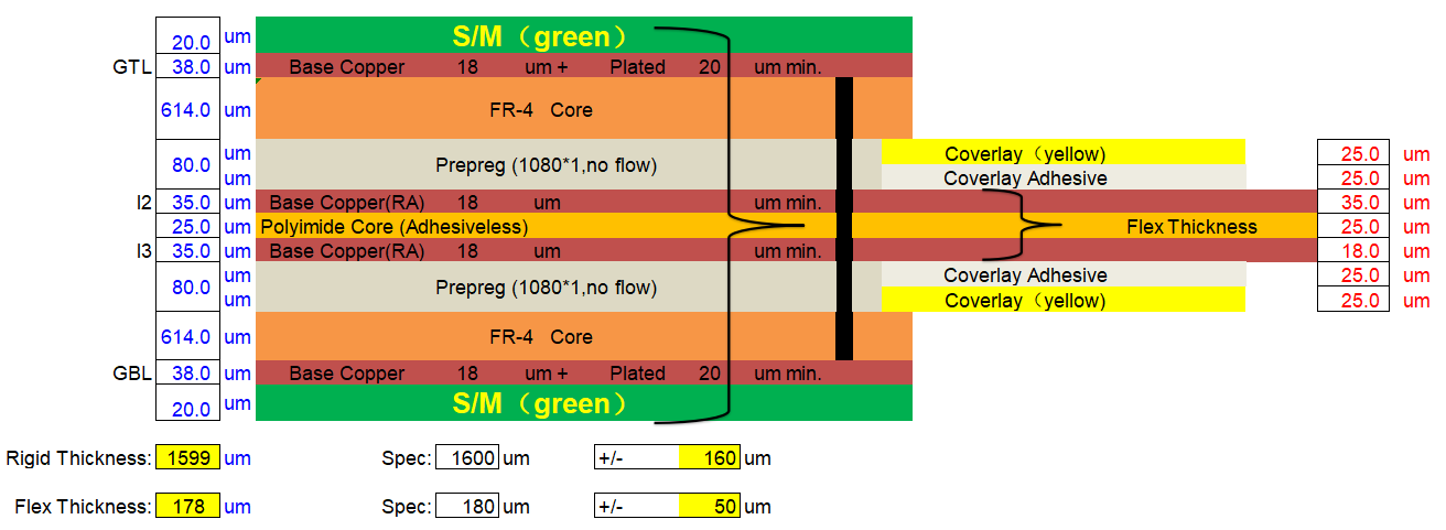 If you require stack-up of different copper thicknesses, different flex layer, different PCB thickness, please contact your sales representative or our online service for further details.
