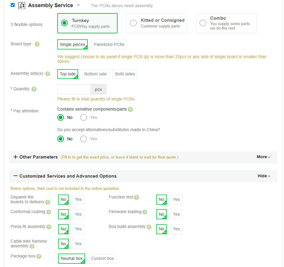 On the PCB quotation page, locate the Assembly Service option. Select this option to proceed with PCB assembly–related settings.
