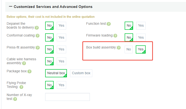 Within the Assembly Service section, find “Box Build Assembly” and set it to “Yes” to request full product assembly.