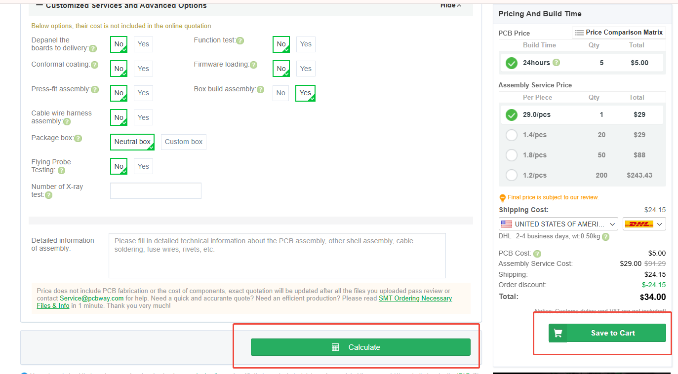 After confirming that all PCB specifications are correctly selected, click “Calculate” to review the estimated quote. Then click “Save to Cart” to submit the order.