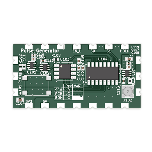 This pulse generator is designed to provide precise timing signals with flexible pulse width options. Powered by two input voltages of 5V and 3.3V, it generates a single pulse triggered on the rising edge of the TRIG pin. The pulse amplitude is dependent on the load, offering 1.65V into a 50-ohm load or 3.3V in a high-impedance (Hi-Z) load.