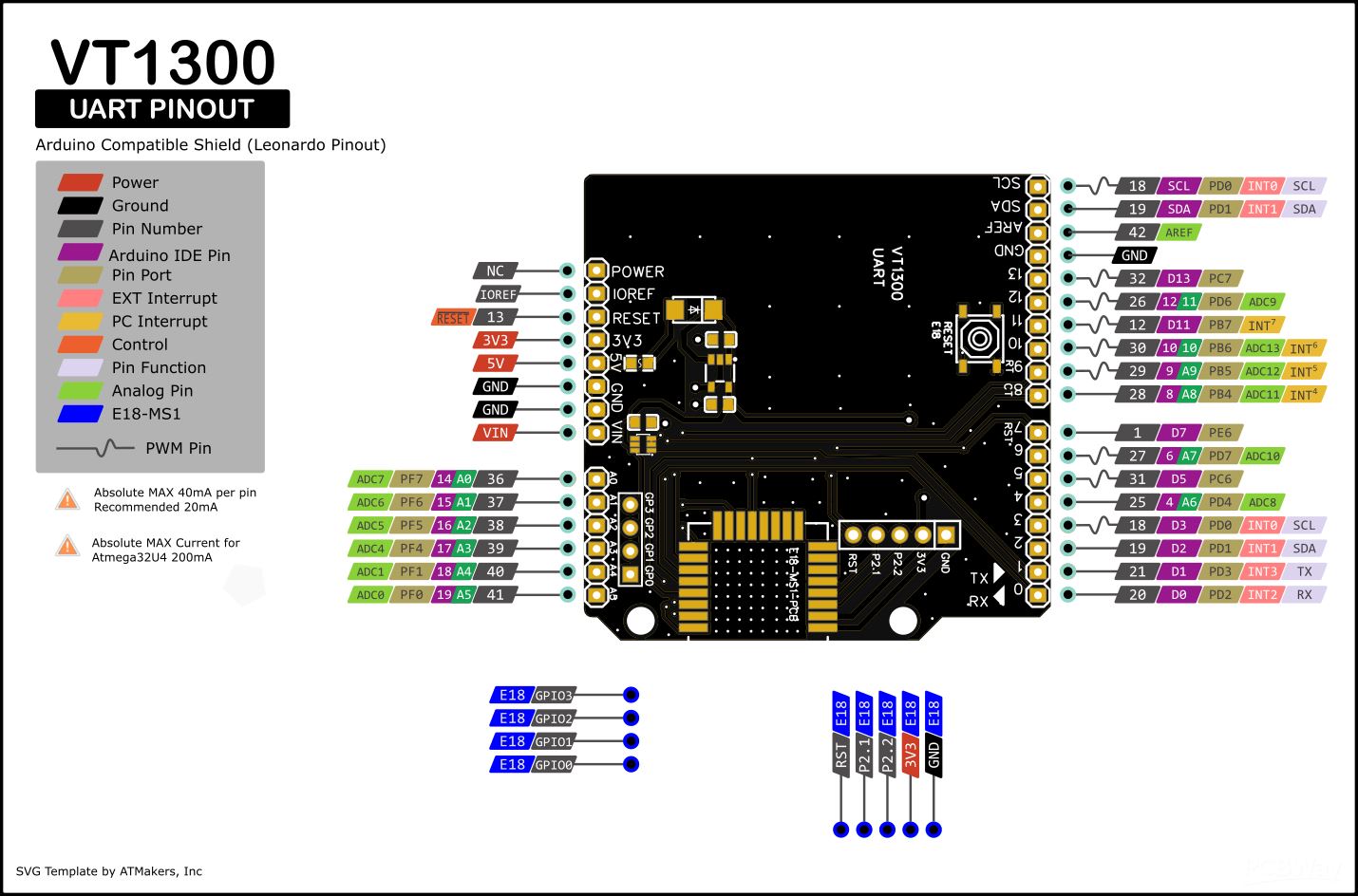 The VT1300 Shield is designed to be used with the Arduino Leonardo. An Arduino library and examples are available on GitHub.