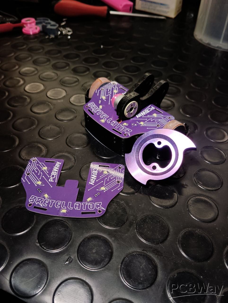 This is the titanium weapon I made for my Bretellator combat robot. The workmanship was impeccable; there were no problems with ordering or using it. The measurements are accurate enough for this purpose. Note that I made the purple anodizing myself, not PCBWay.