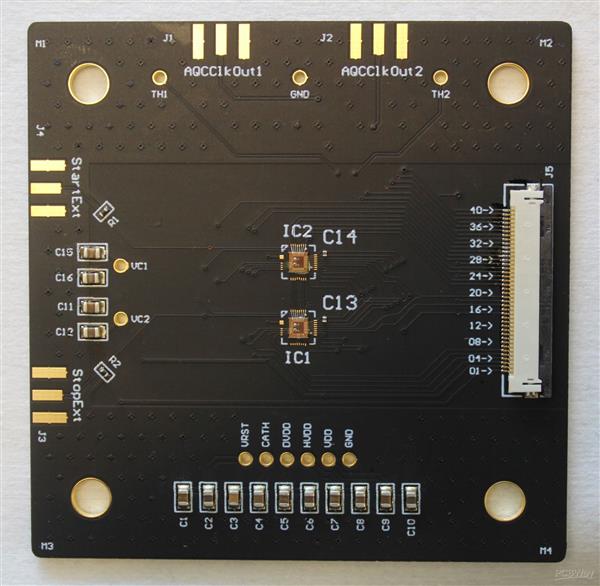This is a simple test board for evaluating the performance of a diffuse optical tomography imaging chip. The pictures below show the full circuit board, as well closeups of the chip wire bonded directly onto the PCB. Wire bonding directly to the PCB requires an ENEPIG surface finish. I've had problems with other PCB vendors because their ENEPIG surface finish is low quality and cannot be wire bonded. I have never had this problem with PCBWay. Their ENEPIG surface finish bonds perfectly every time, and PCBWay has become my go-to PCB vendor for this reason.