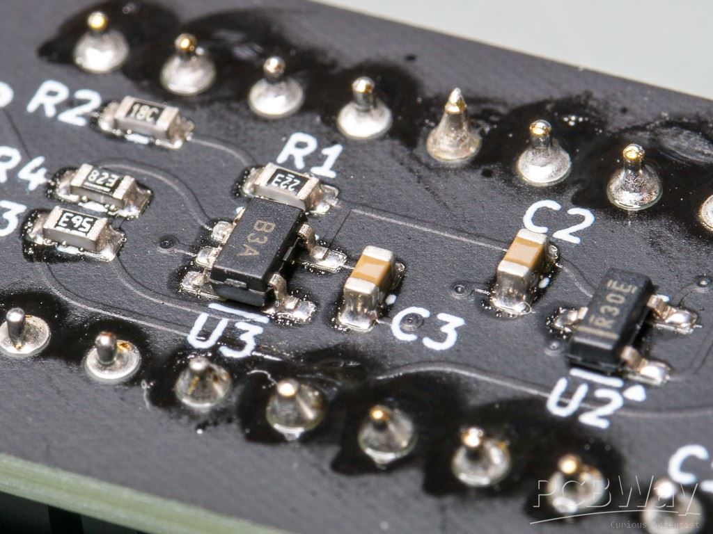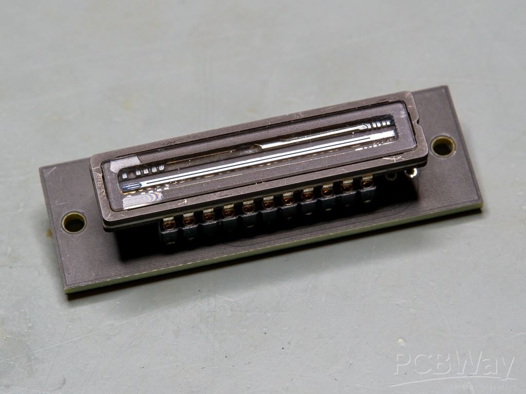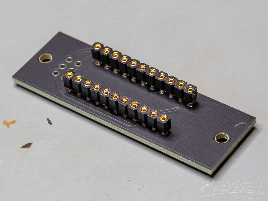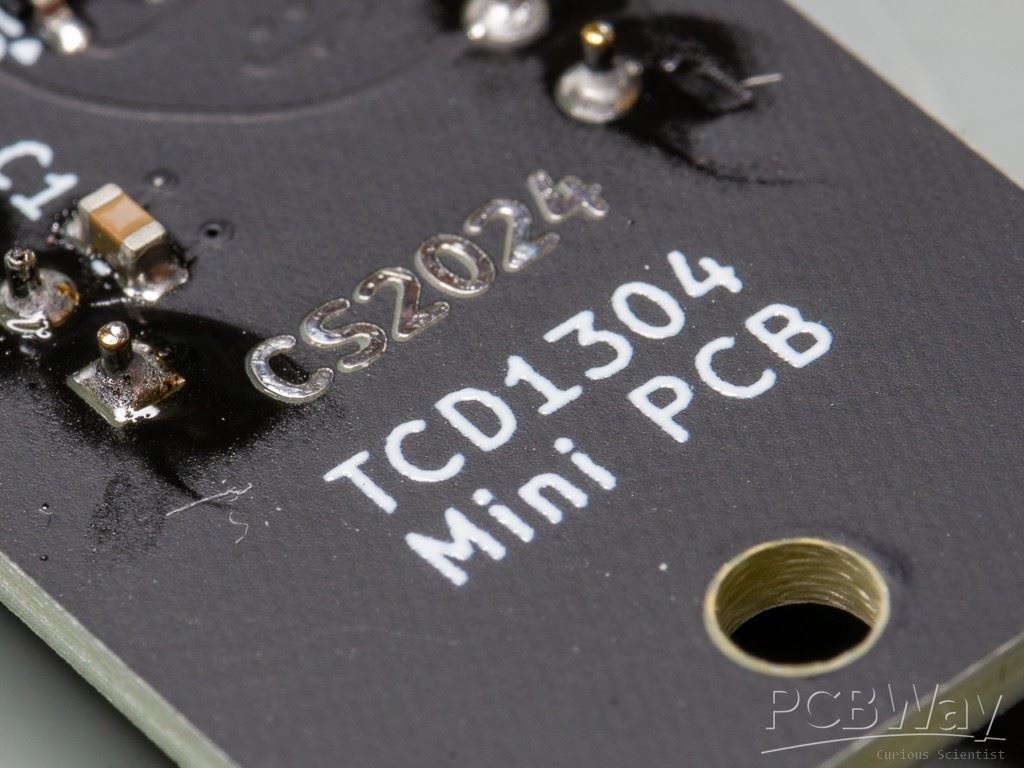 I designed this miniature PCB to allow mounting and placing the TCD1304 linear CCD independently from its driver microcontroller. The board is designed to be produced in matte black colour to minimise stray reflections. The colour turned out to be great. Tolerances are well kept, and the production quality is good.