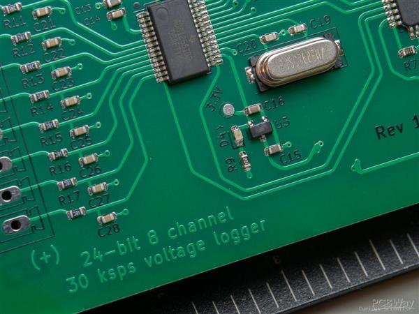 This is the revised version of my previously built custom ADS1256 board. I fixed all the issues I had with the previous board and added a few tiny extra things. I also went for the black silkscreen. I recommend this color if you want to give more emphasis for the components and want to have the silkscreen "hide" in the background. It does not give as strong contrast with the green PCB as the white silkscreen but it is still readable. This time I also gave a little challenge to PCBWay: I "melted" my traces and I put teardrops around the tabs. The designed traces became more curved and the teardrops added some complexity to them as well. Nevertheless, the boards turned out great, I could not notice any issues with them. The mounting pads are also great as well as the outline of the board. Smooth and nice cutting. I am satisfied, thank you!