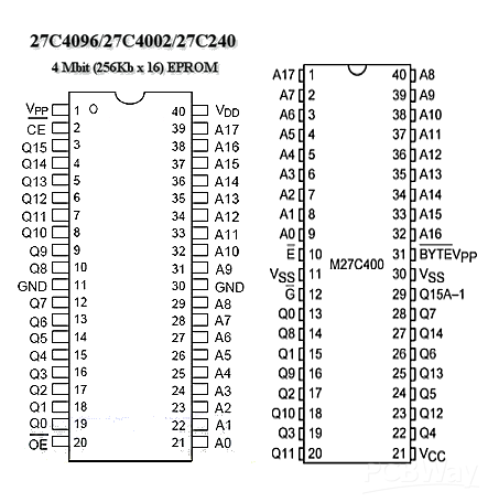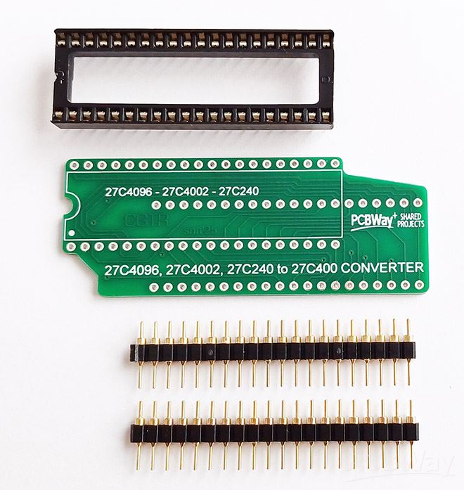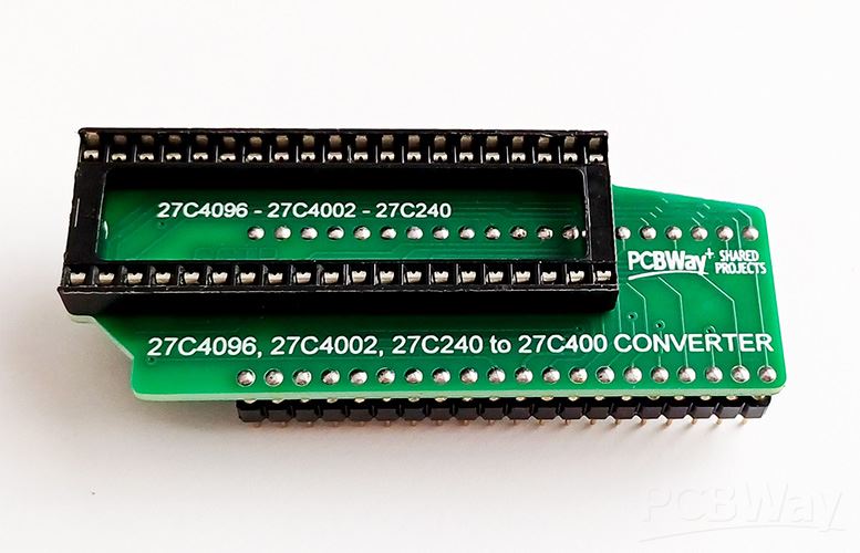 This adapter converts 27C4096, 27C4002, 27C240 (DIP40) EPROMs to 27C400 EPROM (DIP40).