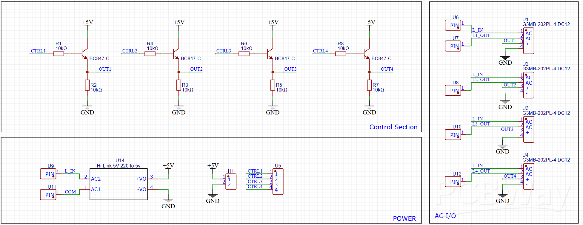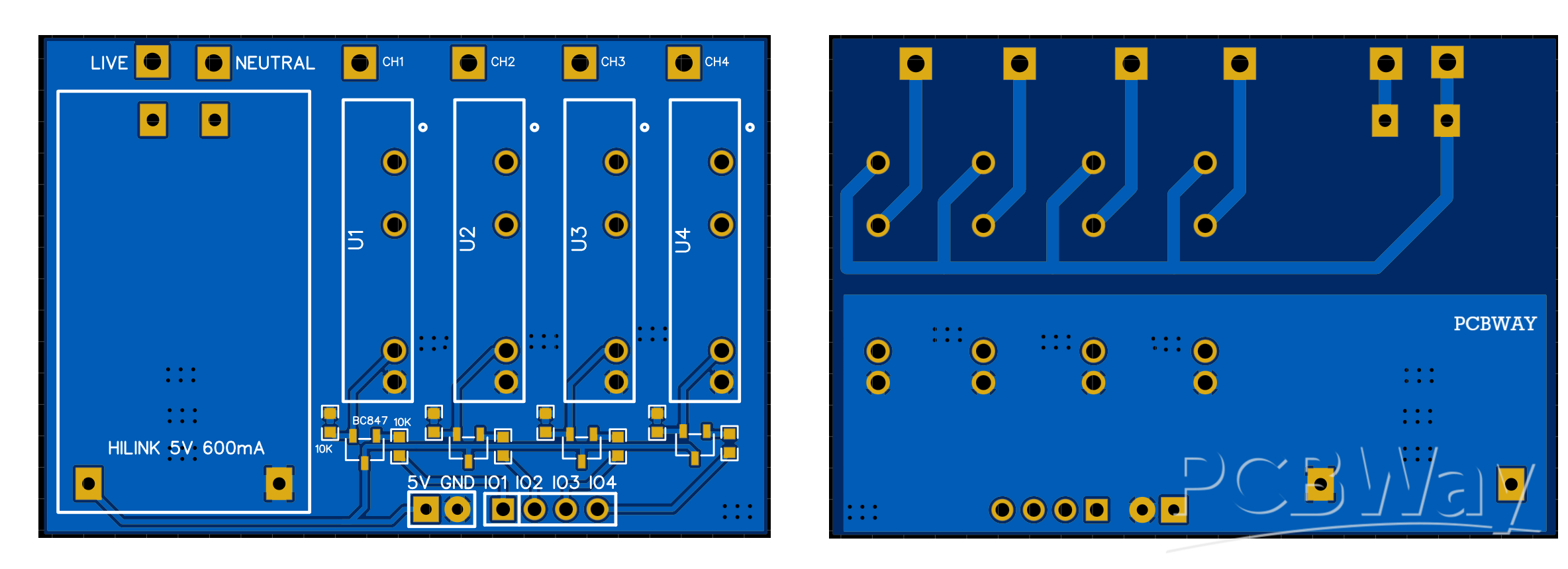 The circuit diagram is quite simple, we have a power conversion unit onboard which helps in switching of these relays. And to make them controllable through a single pin we have transistor drivers, the base is pulled low with the help of 10K resistors. The circuit does not have any capacitor but you can add one between the 5v and GND power line. I used the SMT parts to make it look cleaner as seen in the PCB below.