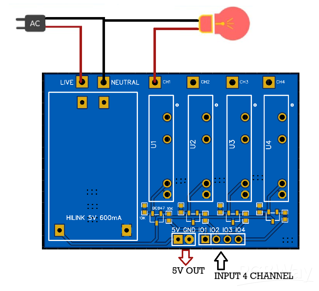 Coming to the relay part they have 4 pins, 2 for the DC 5v power controlled through transistor and headers. And two for AC, here we have to understand when the control signal is given the transistor makes the relay to switch and the relay will short the internal AC pins together to make the flow electric current through them. The application circuit diagram is given below, do the same to turn on/off the load devices. One more thing these relays are based on triac operation, so we can not apply DC to the AC pins, it will alter the operation of the device and can cause burn issues.