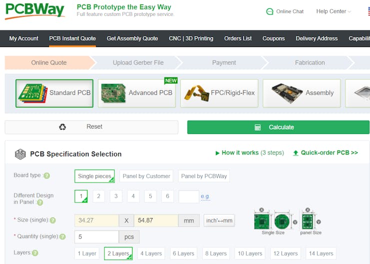 Go to PCBWay > Fill the size of board > choose color and finishing > save it to cart > upload the Gerber files > checkout and make payment.