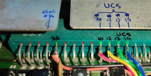 Solder the five wires into the five holes like in the picture (note: the orange wire is barely visible in the picture. It's soldered into the hole labelled "6502 #34" between the two sockets on the left; the solder joint is covered by the red wire in the picture).