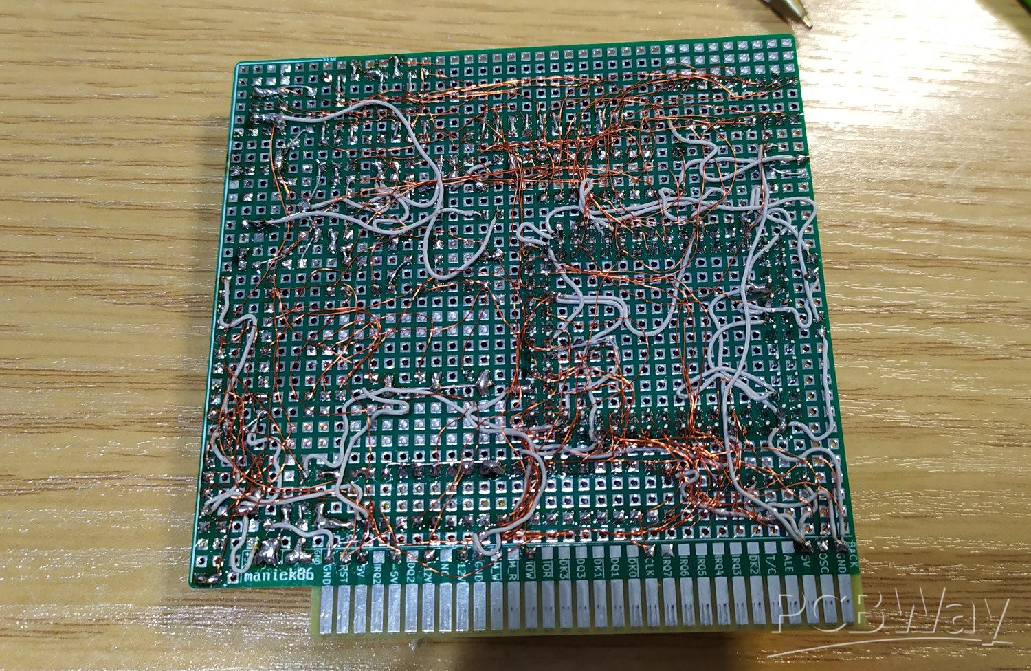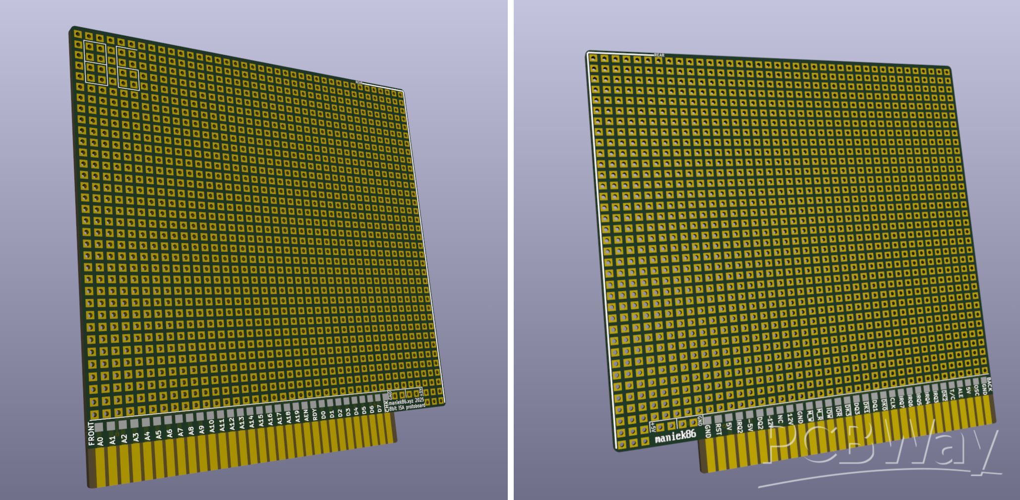 1336 (39*34+10) hole 8-bit ISA prototype PCB for designing cards for retro PCs. Designed to be cheap (size 99.5mm x 99.5mm) and have as many holes as possible.