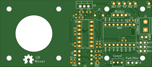This PCB allows manual control of a stepper with a button for forward and reverse, and a speed adjust pot. Useful for quick prototype/test