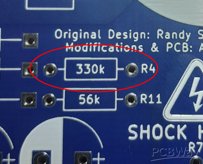Figure 1: The red ellipse shows the resistor value as 330k on the PCB silkscreen. This needs to be changed to 150k.