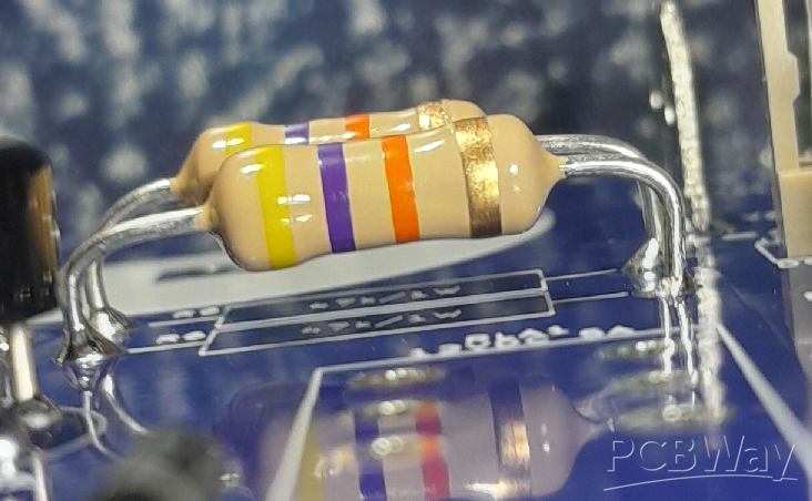 Figure 2: Example "air-gap" of the 1W resistors. This helps with air flow around the component and prevent charring of the PCB if they get hot. ZD1 should also have an "air-gap".