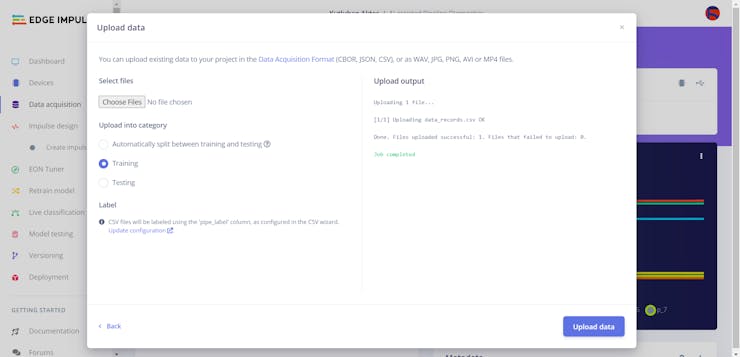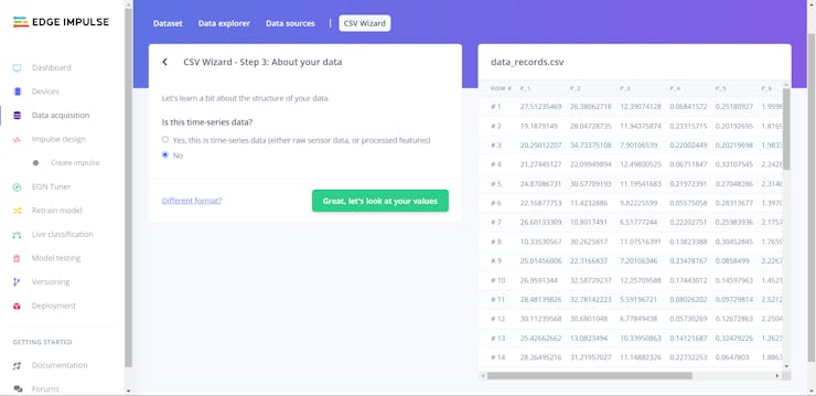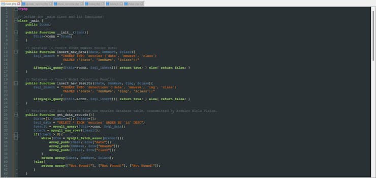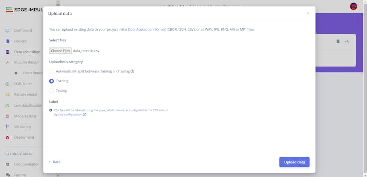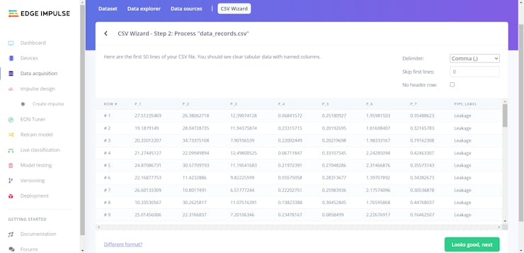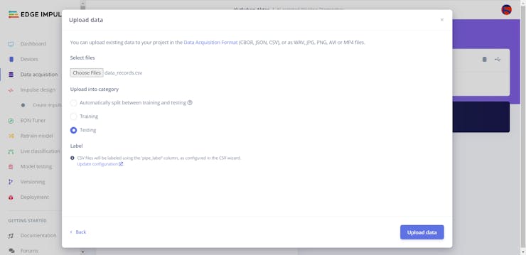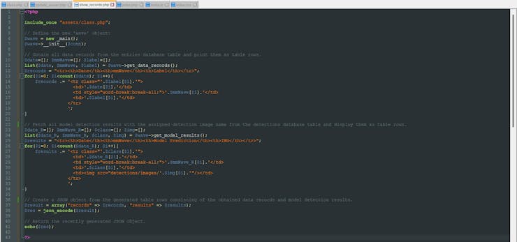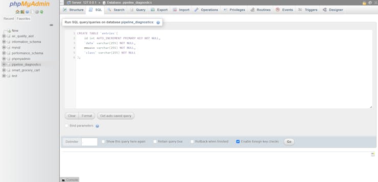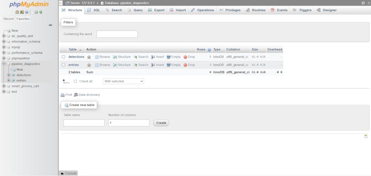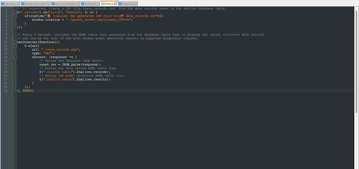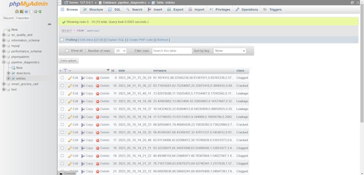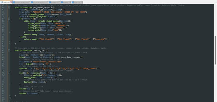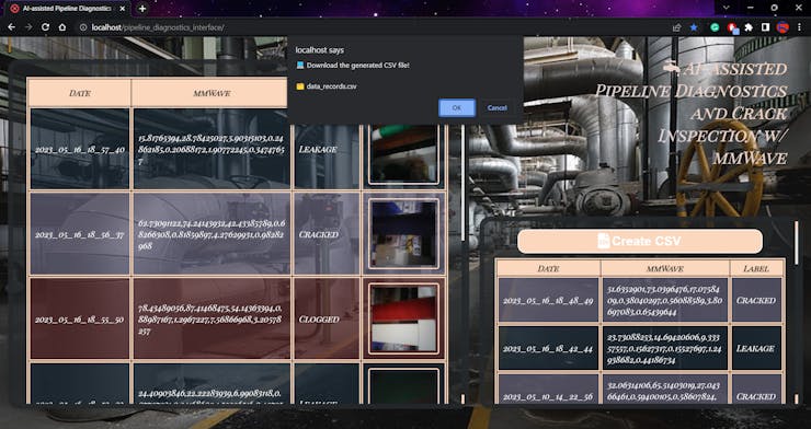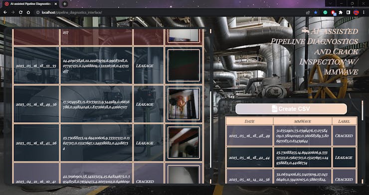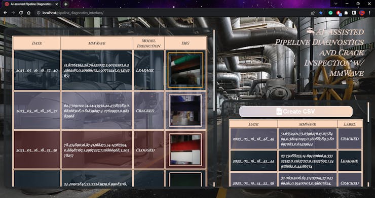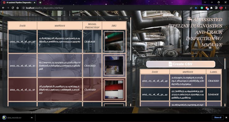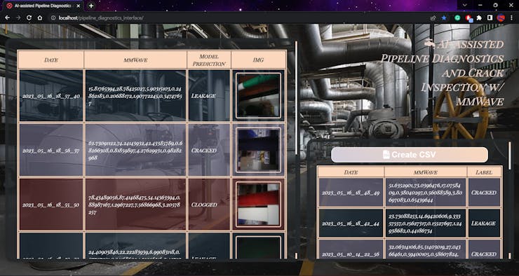 Since I focused on building a full-fledged AIoT device diagnosing pipeline system defects, I decided to develop a web application from scratch providing various features to the user. Firstly, I employed the web application to obtain the collected mmWave data parameters with the selected label from Nicla Vision via an HTTP GET request, save the received information to a MySQL database table, and display the stored data records on its interface in descending order. Via a single HTML button on the interface, the web application can also generate a pre-formatted CSV file from the stored data records in the database without requiring any additional procedures.