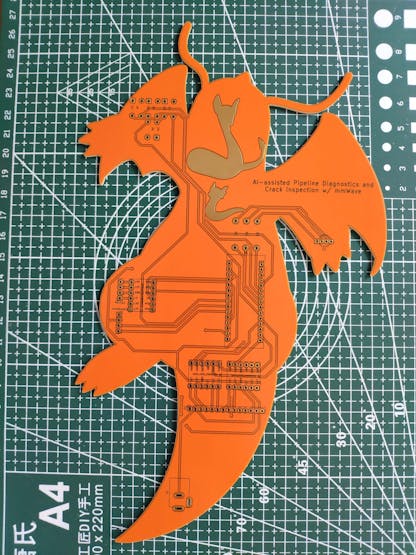 Considering harsh operating conditions, I decided to design a unique PCB after completing the wiring on a breadboard for the prototype and testing my code and neural network model. Since I wanted my PCB design to emanate a unique and powerful water-damage sensation, I decided to design a Dragonite-inspired PCB since it was the first scary water-related Pokémon for me from the anime, despite being a Dragon/Flying type Pokémon. Thanks to the unique orange solder mask and blue silkscreen combination, only provided by PCBWay, this PCB turned out to be my coolest design yet :)