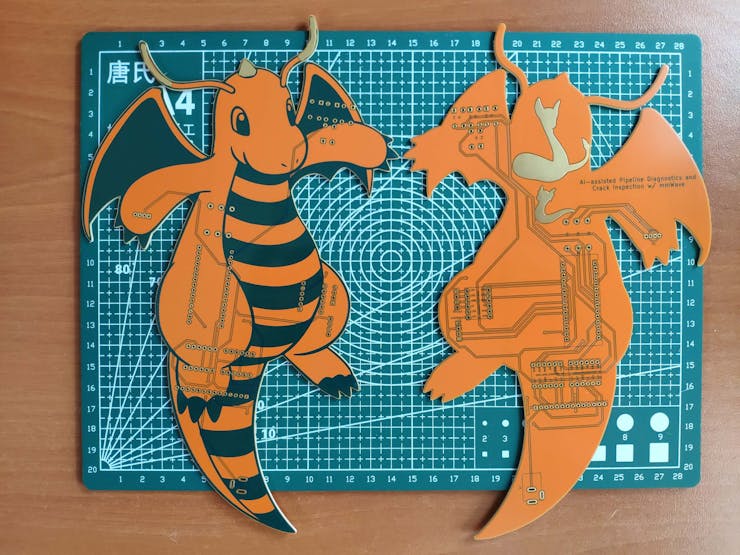 Then, I designed my Dragonite-inspired PCB by utilizing KiCad. As mentioned earlier, I wanted to design my PCB based on Dragonite since it was the first Pokémon that made me afraid of a water attack out of nowhere, despite being a Dragon/Flying type Pokémon :) Thanks to the unique orange solder mask and blue silkscreen combination, only provided by PCBWay, this PCB conveys a unique and effective water-damage sensation. I attached the Gerber file of the PCB below: You can order my design from PCBWay to build this device diagnosing pipeline system defects.