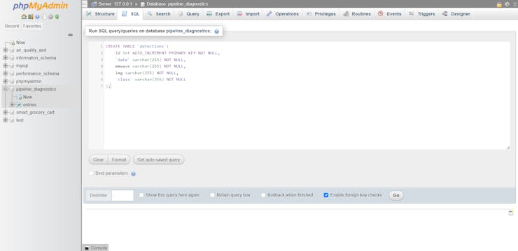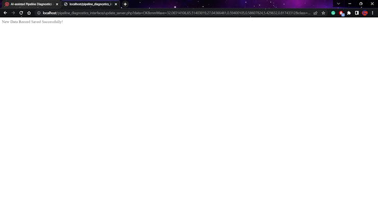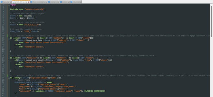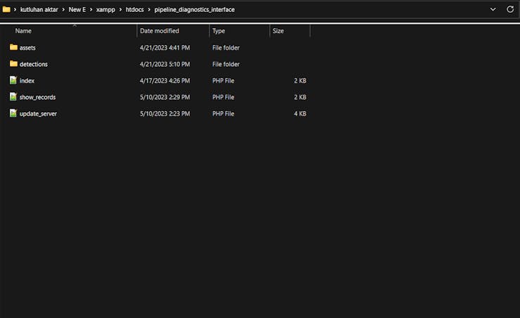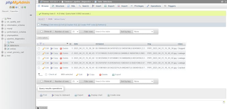 Then, I utilized the web application to obtain the model detection results with captured images of the deformed pipes from Nicla Vision via HTTP POST requests, save the received information to a particular MySQL database table, and display the stored model results with the assigned detection images on the application interface in descending order simultaneously.
