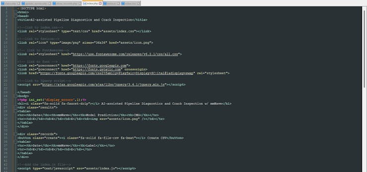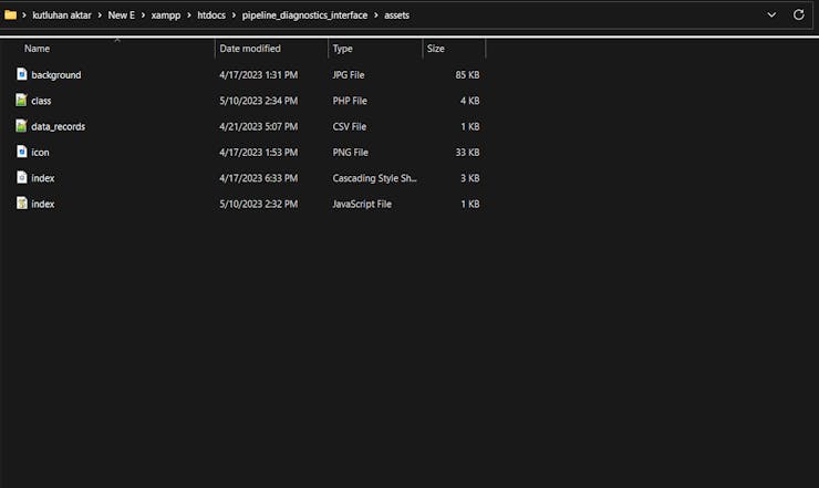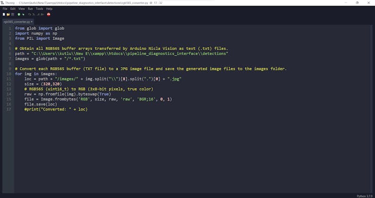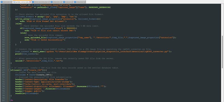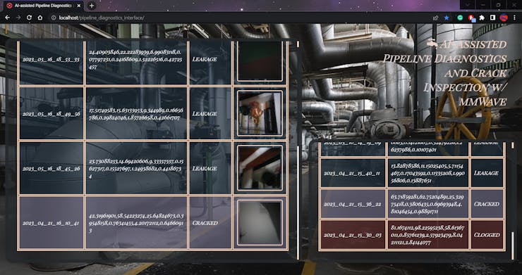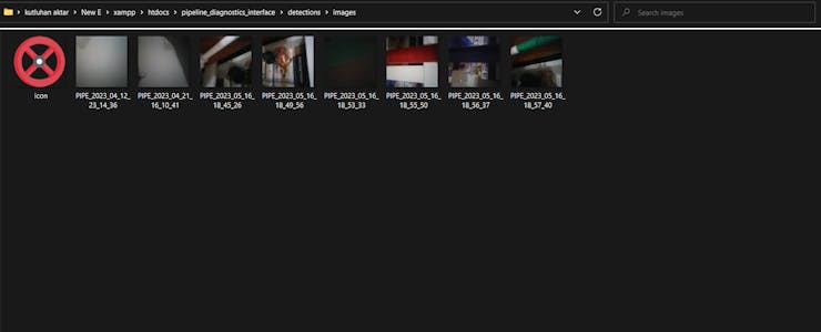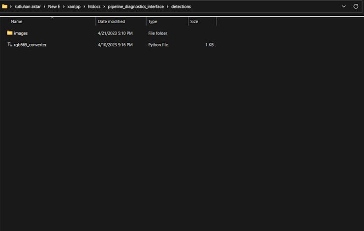 Due to the fact that Nicla Vision can only generate raw image buffer (RGB565), this complementing web application executes a Python script to convert the received raw image buffer to a JPG file automatically before saving it to the server. After saving the converted image successfully, the web application adds it to the HTML table on the interface consecutively, allowing the user to inspect all previous model detection results and the assigned deformed pipe images in descending order.