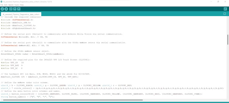 Due to architecture and library incompatibilities, I decided to connect the mmWave module and the ILI9341 TFT LCD screen to Arduino Nano so as to extract and display data parameters. Then, I utilized Arduino Nano to transmit the collected mmWave data parameters and user commands to Nicla Vision via serial communication.