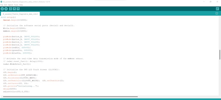 To diagnose different pipeline defects, I needed to collect accurate vibration measurements from a pipeline system so as to train my neural network model with notable validity. Therefore, I decided to build a simple pipeline system by utilizing pipes and fittings (adapters) with mediocre thermal conductivity, demonstrating three different pipeline defects in each primary section — color-coded. Since Seeed Studio provides mmWave radar modules with built-in algorithms to detect minute vibration changes to evaluate respiratory rate, heart rate, and sleep status, I decided to utilize a 60GHz mmWave module to extract my data parameters via the mentioned algorithms. Since Arduino Nicla Vision is a ready-to-use and compact edge device with a 2MP color camera and integrated WiFi/BLE connectivity, I decided to use Nicla Vision so as to run my neural network model, capture images of the deformed pipes, and inform the user of the model detection results with the captured pipe images. Due to architecture and library incompatibilities, I connected the mmWave module to Arduino Nano in order to extract and transmit radar data parameters to Nicla Vision via serial communication. Then, I connected four control buttons to Arduino Nano to send commands with the collected mmWave data parameters to Nicla Vision. Also, I added an ILI9341 TFT LCD screen to display the interface menu, including a custom radar indicator.