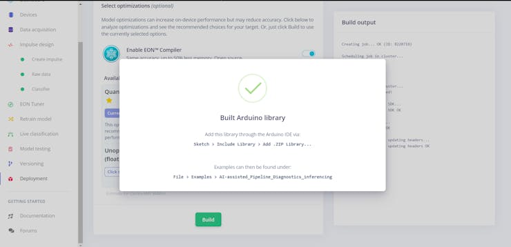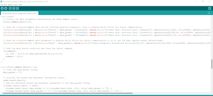 After training and testing my neural network model, I deployed and uploaded the model on Nicla Vision as an Arduino library. Therefore, the device is capable of diagnosing pipeline system defects by running the model independently without any additional procedures or latency.