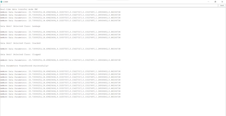 🚿🔎📲 After Nicla Vision receives the mmWave data parameters with the Run command, it runs an inference with the Edge Impulse neural network model by applying the received mmWave data parameters to diagnose pipeline defects and captures an image of the deformed pipe with the built-in GC2145 camera.
