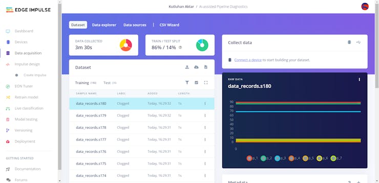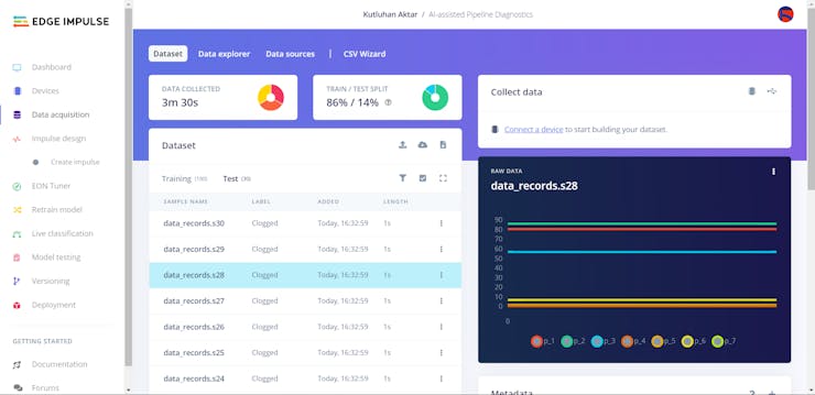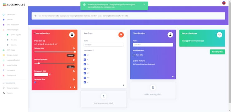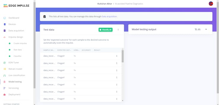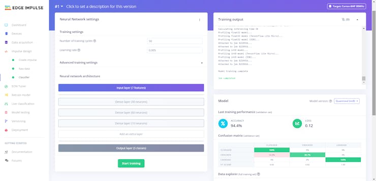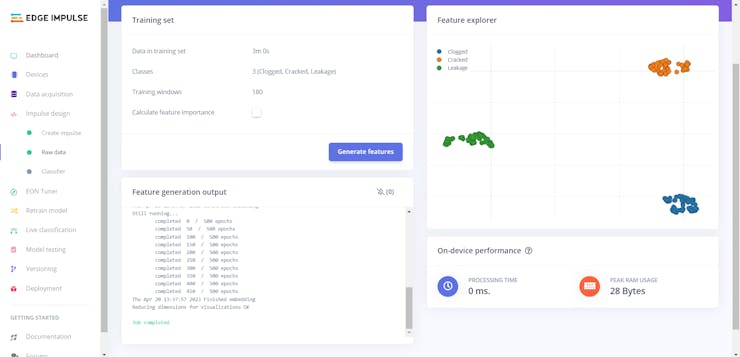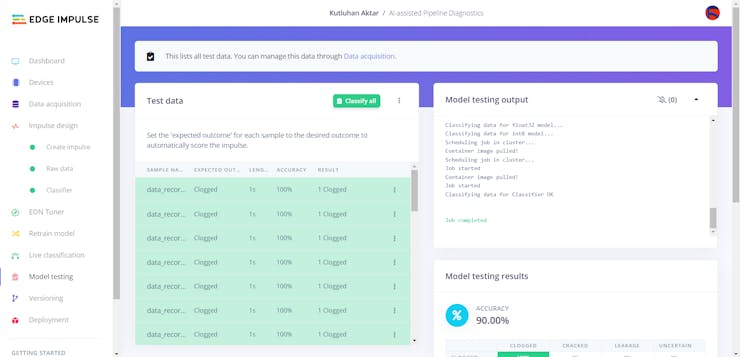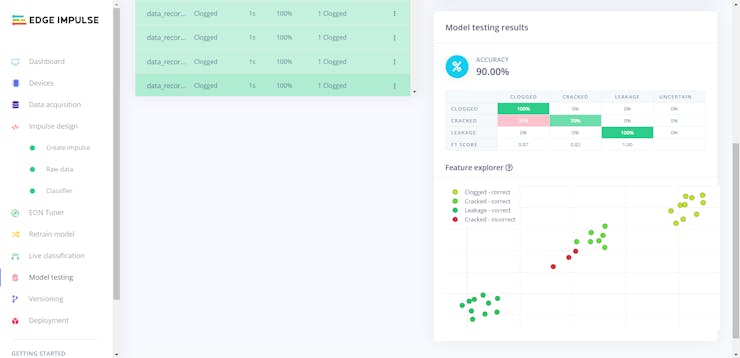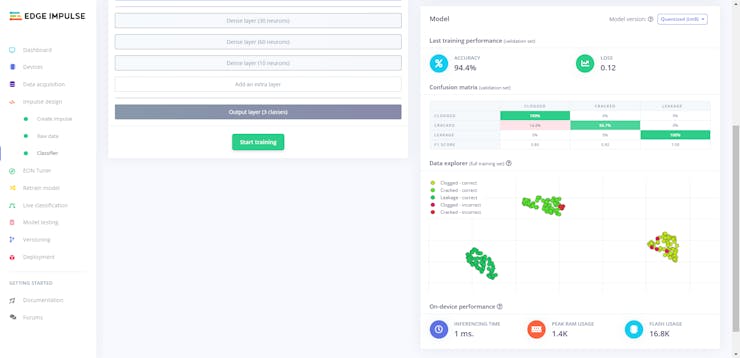After completing my data set by collecting data from the custom pipeline system I assembled, I built my artificial neural network model (ANN) with Edge Impulse to make predictions on pipeline system defects (classes). Since Edge Impulse is nearly compatible with all microcontrollers and development boards, I had not encountered any issues while uploading and running my model on Nicla Vision. As labels, I utilized the three basic pipeline defects manifested by each main line (color-coded on the system):