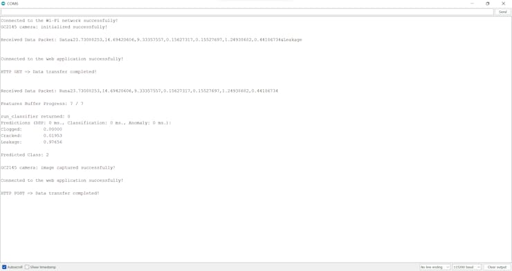 After executing the AI_assisted_Pipeline_Diagnostics_run_model.ino file on Nicla Vision: