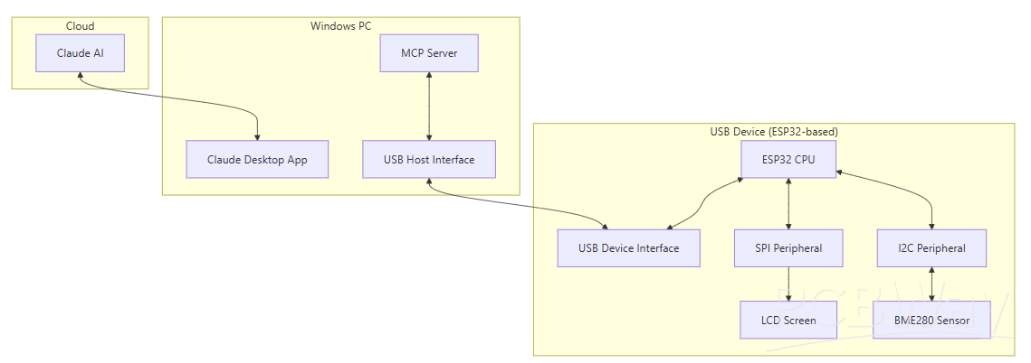 3. The MCP server translates this instruction and forwards it to the **USB hardware device** via a Python-based USB host interface.